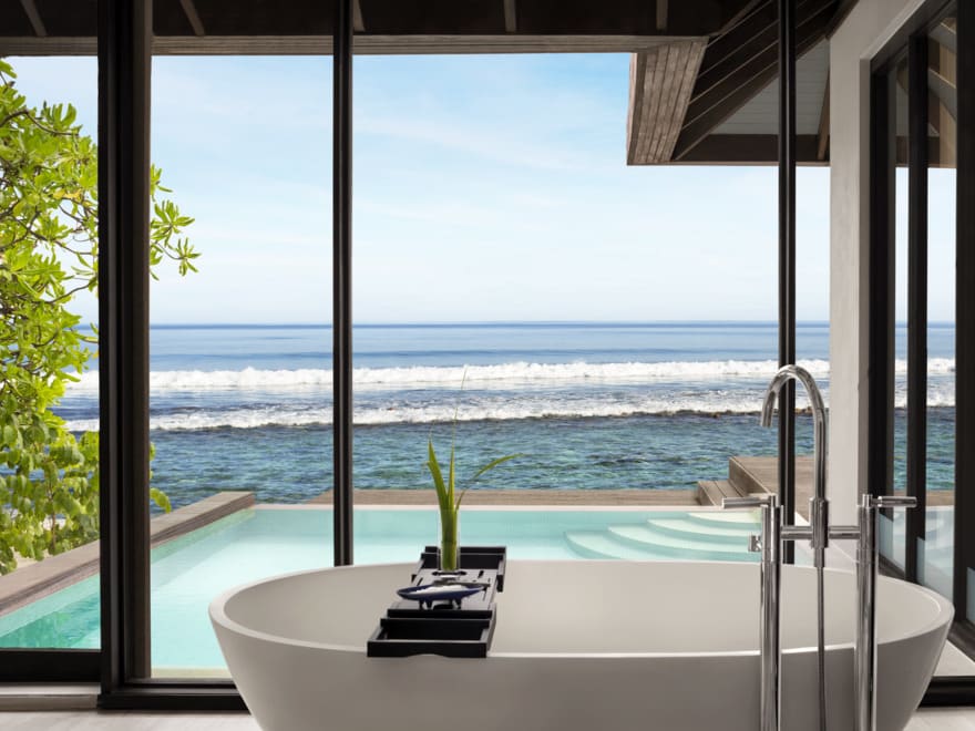 原始的馬爾地夫海景別墅,馬爾地夫原始的馬爾地夫海洋泳池別墅,享有壯麗的景色。在馬爾地夫度蜜月時,在波光粼粼的印度洋上,欣賞絢麗的日落。在您自己的海洋泳池別墅中體驗夢想假期。坐落在僻靜的懸崖邊緣,享受更多的隱私、藍色的海洋全景,偶爾還能瞥見多尼船駛入地平線。在陽光明媚的日子裡,您可以在我們馬爾地夫蜜月別墅的私人泳池中暢遊,泳池俯瞰著洶湧的大海。在獨立浴缸中享受長時間浸泡或享受幸福的戶外花灑淋浴。在星空下用餐,享用一瓶來自您酒窖的葡萄酒,並享受別墅主人的周到服務。