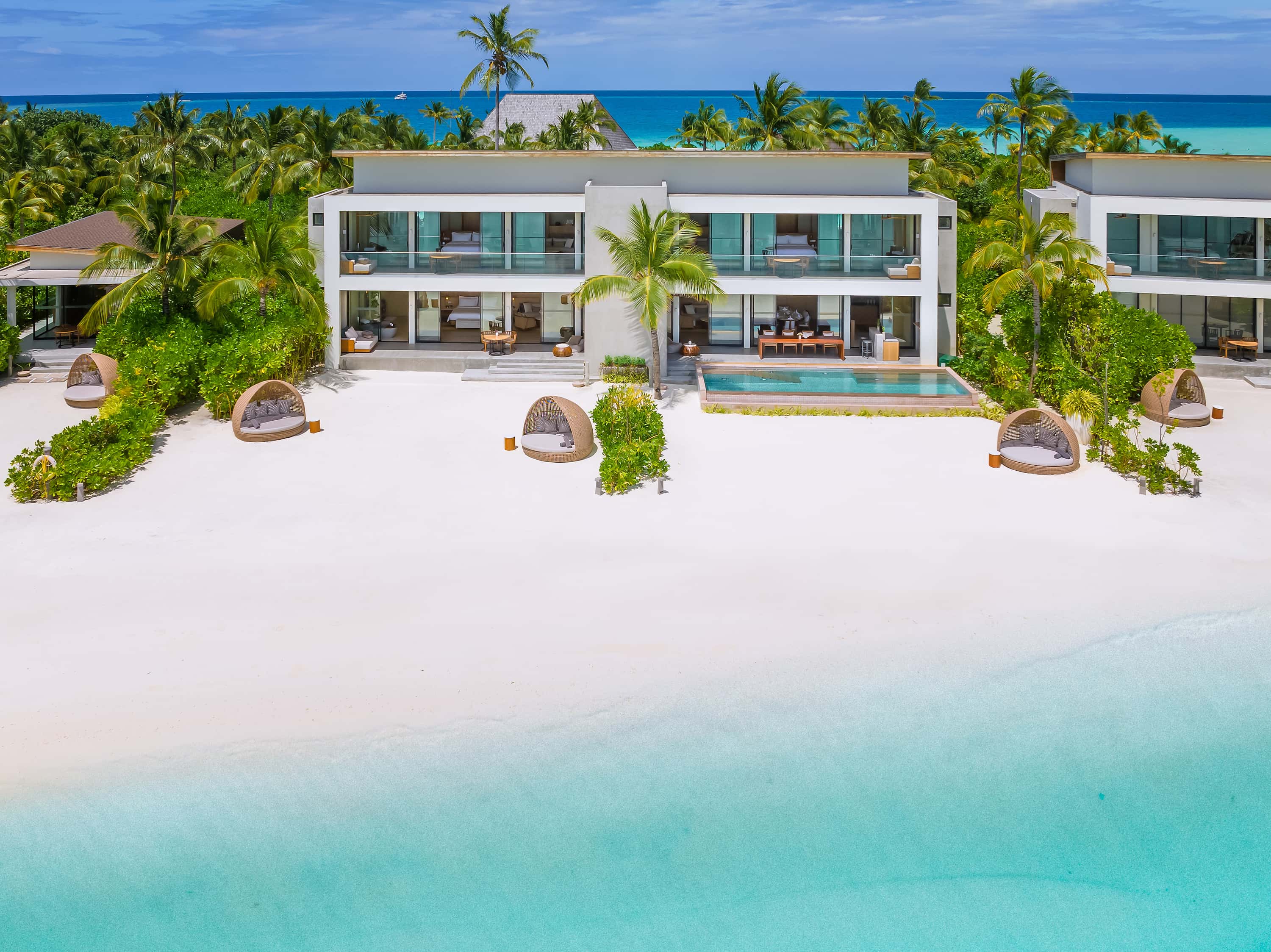 有華麗的主臥室、一個適合聚會的起居空間,以及面朝藍色潟湖的大型游泳池。
