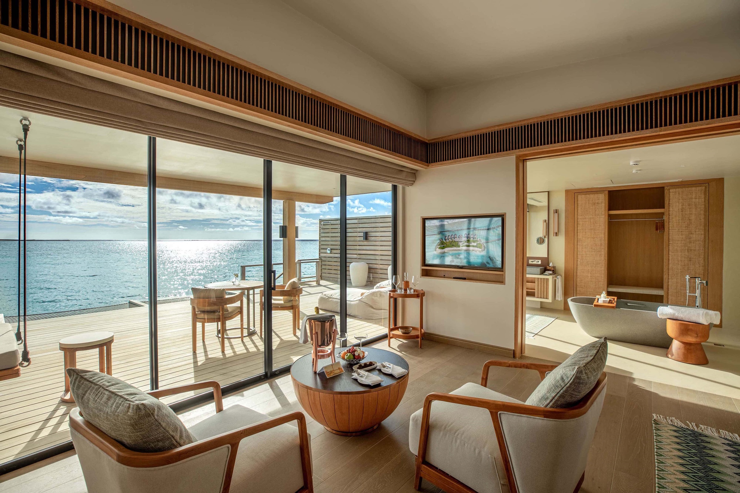 專為絕對隱私而設計,在面向大海的特大號床上或浸泡浴缸中,抑或是在戶外私人泳池,欣賞無邊的地平線,