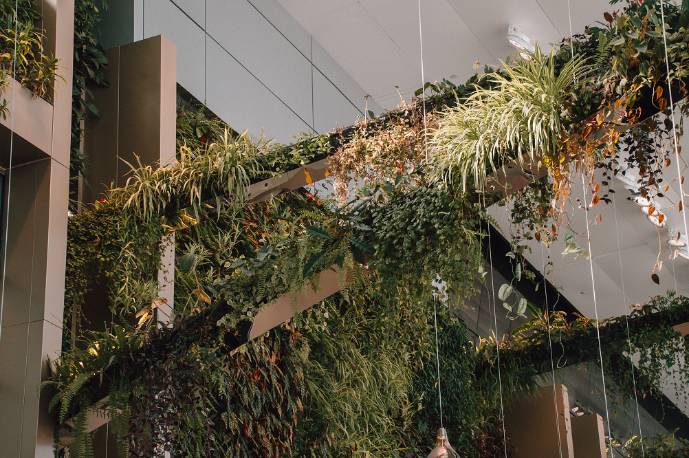 迎接乘客的是長達 180 公尺的驚人牆壁,牆壁上覆蓋著綠色植物和攀緣植物,優雅地懸掛在頭頂上。對於任何在飛行前享用餐點或快餐的人來說,這都是一次非凡的體驗。