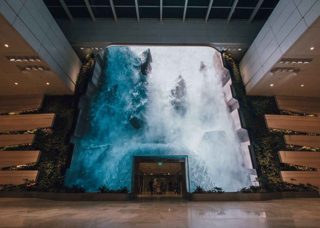 The Wonderfall 位於 2 號航站出境大廳。 這座令人印象深刻的 14m 高、17m 寬的 LED 牆位於兩個垂直花園間,橫跨 2 號航站出境大廳的高度。 弧形 LED 螢幕讓您從任何位置都能獲得良好的視野。