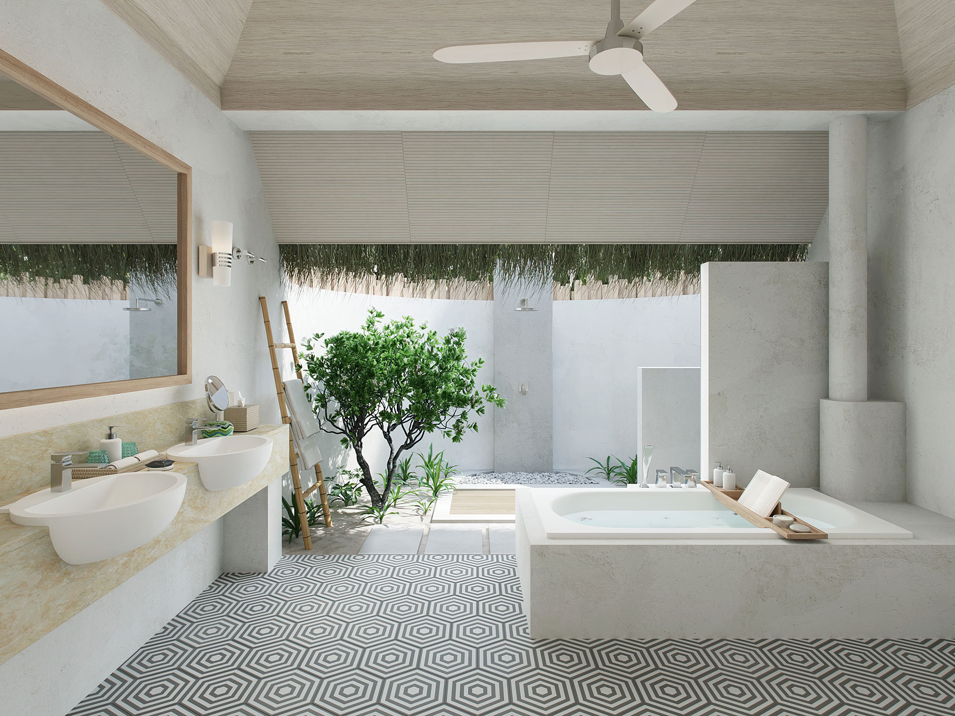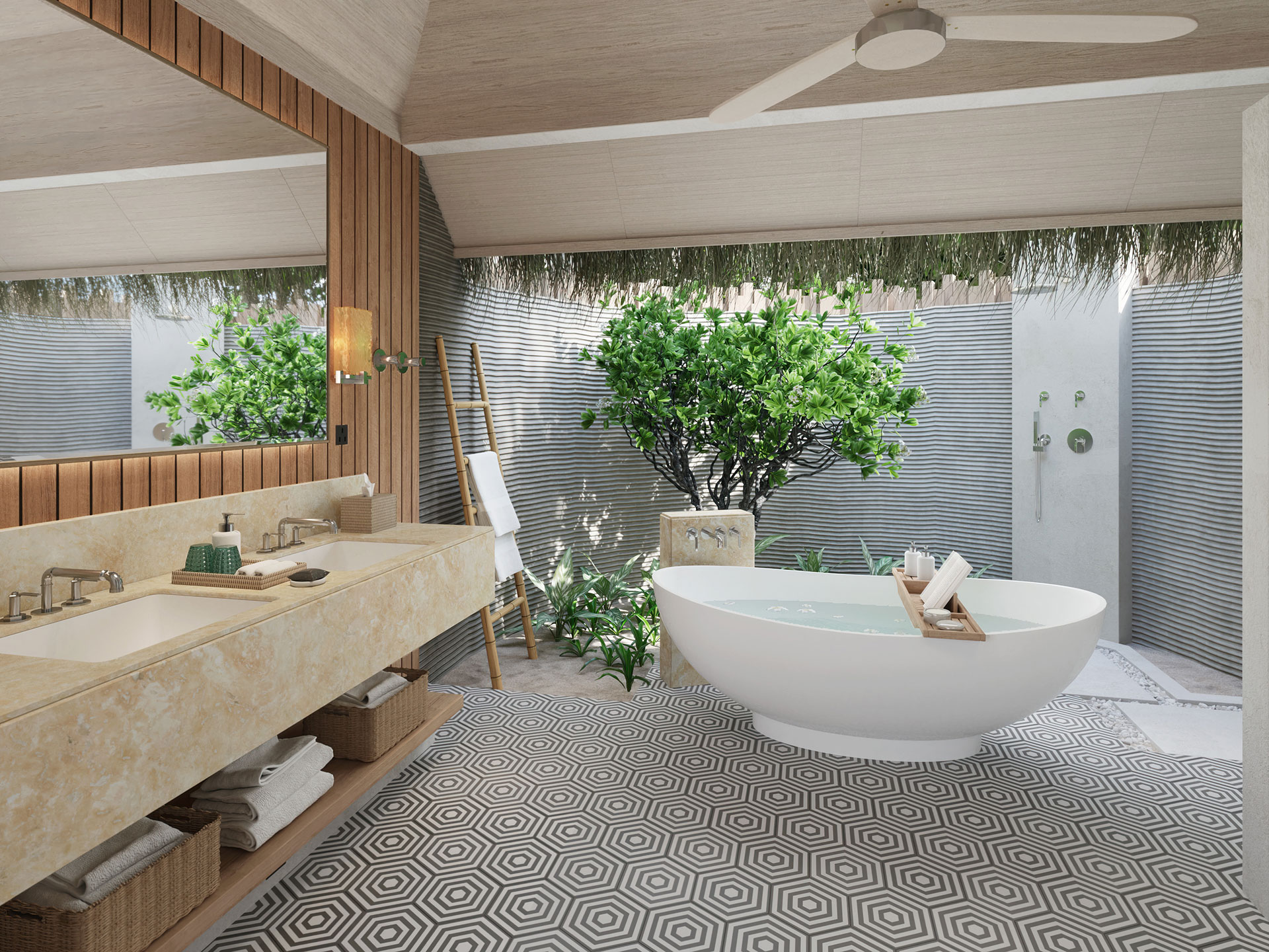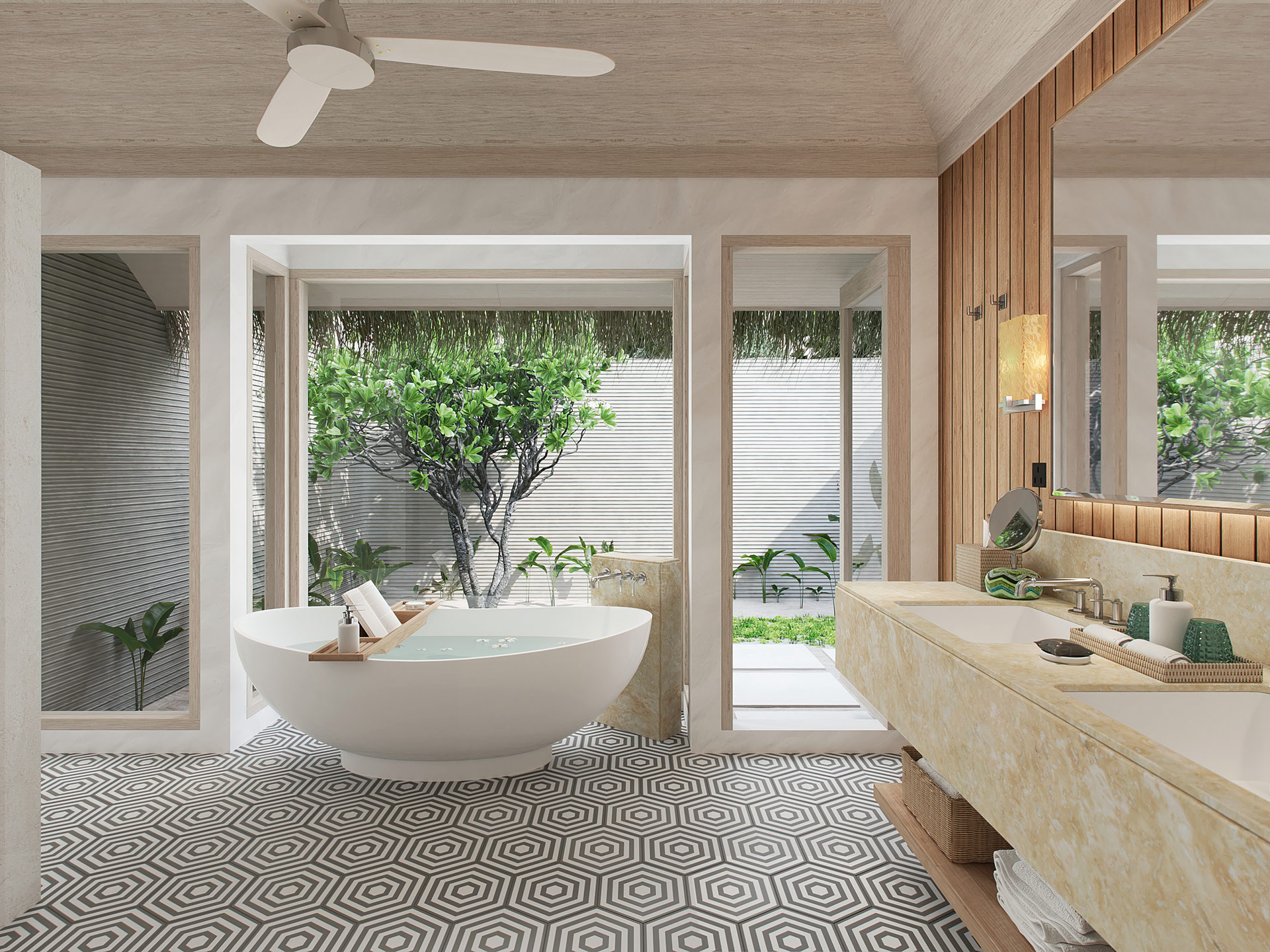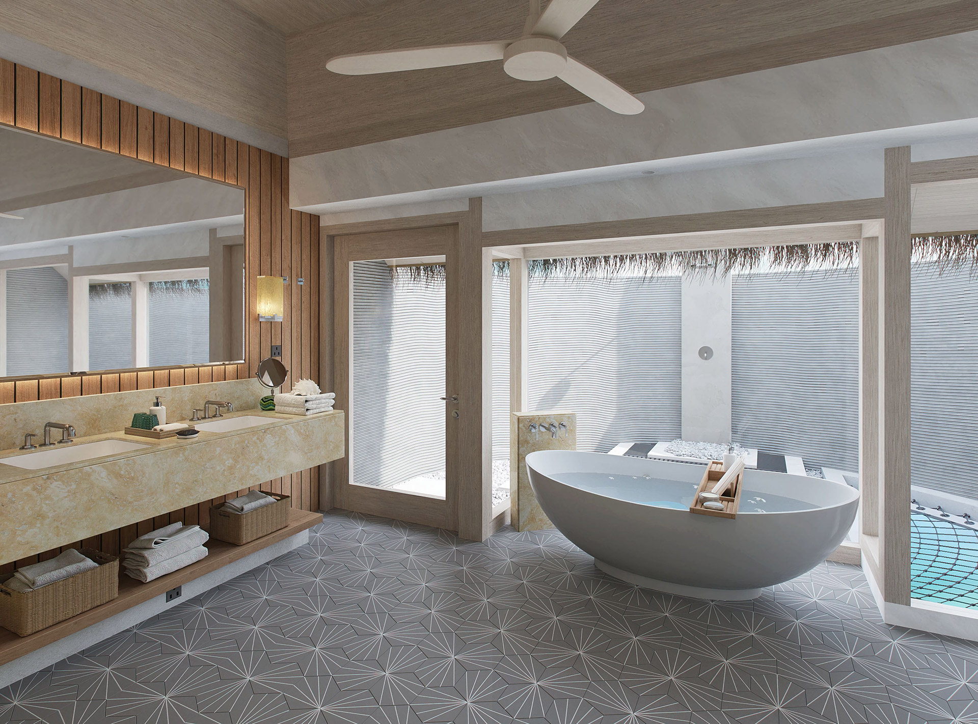 熱帶海灘度假勝地! 該島擁有馬爾地夫最大的海灘之一,細白的沙灘¸ 別墅大部分設有私人游泳池,採用可永續環保材料建造,室內設計融合了自然優雅與現代氛圍。
