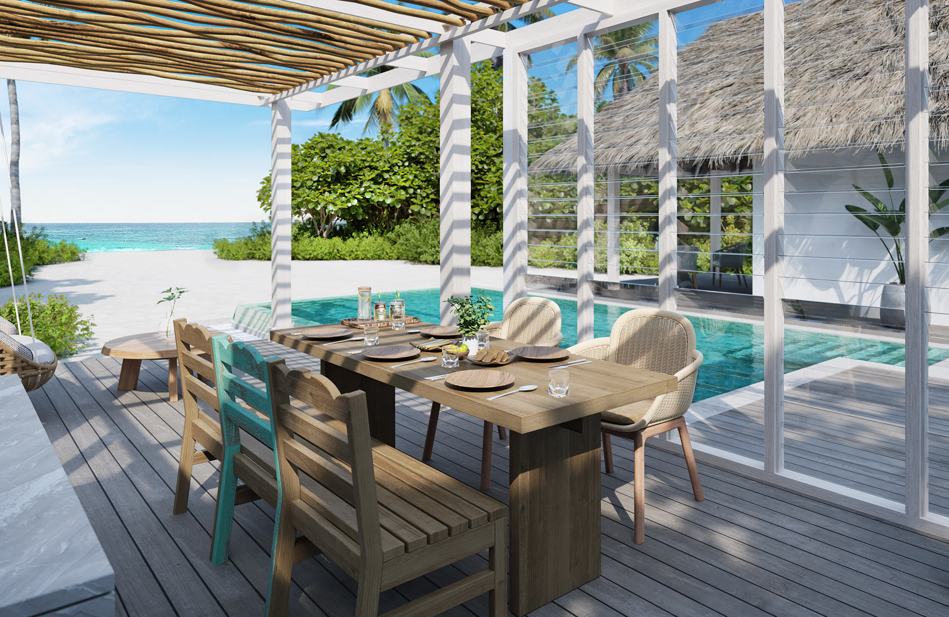 馬爾地夫海灘泳池別墅坐落在柔軟的細白蜜粉沙灘上,設有私人游泳池,可直接通往大海,並享有壯麗的景色。
